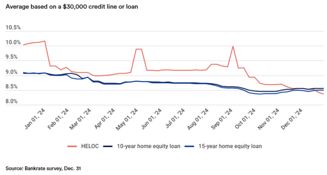 • HELOC rates: Home Equity Line of Credit (HELOC) rates came in lower last week, with the $30,000 HELOC dropping to an average 8.36%–closing out 2024 with a record low for the year. Home equity loan rates remained the same at 8.41%. The question for 2025 is whether the HELOC will continue to fall: