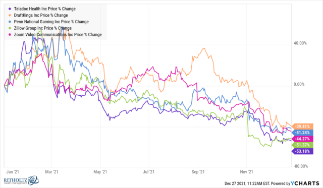 (2) A few areas were clobbered. Many stocks that soared in 2020 didn’t experience the same success in 2021. The ones in this chart were up between 139% and 396% in 2020 but now have a -58% to -68% drawdown.