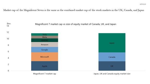 That said, most of 2023 saw a few large technology companies contribute almost all of the gains to the point where the “Mag 7” became more valuable than entire segments of the global markets. The graphic below makes this point nicely.