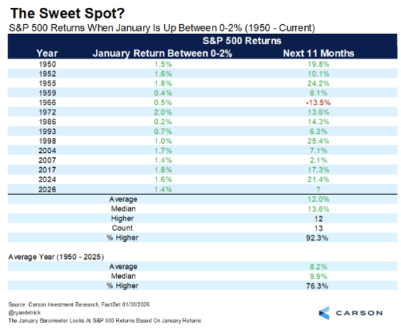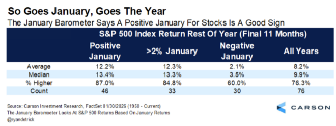 THE JANUARY BAROMETER: In 1972, the late Yale Hirsch introduced the January Barometer phenomenon. Short version—if the S&P 500 is up in January, stocks often have a “good” year.