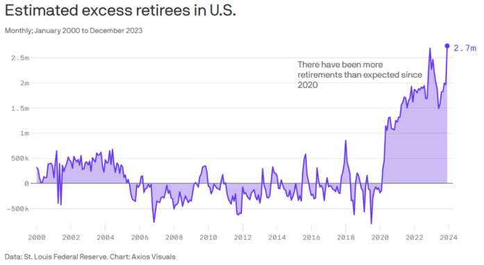Retirement Boom: We are experiencing a second wave of the post-COVID retirement boom. An aging country, combined with a booming stock market and a nudge from return-to-office policies, is enough to make retirement look more attractive. The U.S. has about 2.7 million more retirees than predicted from a model designed by an economist at the Federal Reserve Bank of St. Louis. That number was 1.5 million six months ago—a more than 80% increase. Before the pandemic, there were often fewer retirees than expected.