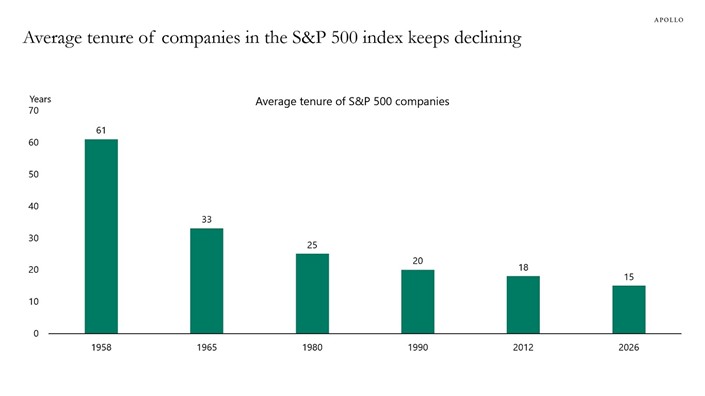 LIFESPAN IN THE S&P 500: The average tenure of a company on the S&P Index continues to decline. It’s currently around 15 years. Several factors could contribute to the churn: