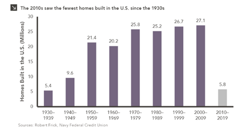On the real estate front, median home prices have increased 25% since early 2020. This appreciation can partially be attributed to the shortage of homes built over the past decade. Additionally, the move towards more remote working has caused an exodus from city living and a greater demand for suburban housing with more space since there is less of a need for commuting. The question now is how will rapidly rising mortgage rates impact the euphoric residential real estate market?