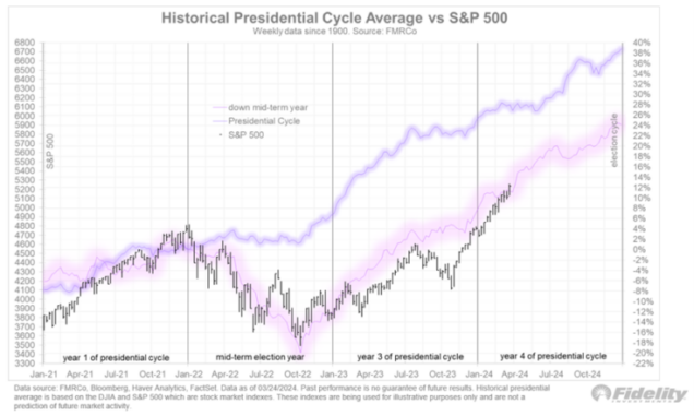 It’s an election year, and as much as the media will obsess over the impact, there’s been a reasonably consistent pattern for the Presidential cycle. As you can see from the chart above, this cycle follows the pattern very closely.