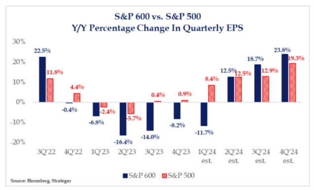 Earnings estimates for large-cap stocks (S&P 500) indicate a trough behind + growth ahead, and small-cap stocks (S&P 600) look poised for the same pattern with a one-quarter lag. A broadening of earnings growth, with less reliance on the mega-tech companies at the top, would be good for the market’s overall foundation.