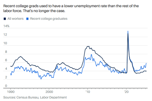 College Grads & Jobs: Speaking of unemployment, the 2025 graduating college classes are experiencing historically weak hiring conditions. In fact, graduate unemployment now exceeds national averages, a rate reversal not seen since the early 1980s.
