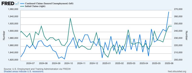 The blue line in the chart above represents continuing unemployment claims, which reflect individuals who remain unemployed and have not been rehired one week after filing. The green line shows initial unemployment claims, indicating those filing for unemployment benefits for the first time.