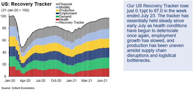 Economy At a Glance: Over the last week, the U.S. recovery tracker plateaued after a five-month upswing. Expanded state openings continued to push demand, travel and employment back to pre-pandemic levels. However, supply chain demands continued to impede production activity. While in some areas, Covid cases increased, the overall health backdrop supports our continued economic healing. All in all, things continue to look positive.