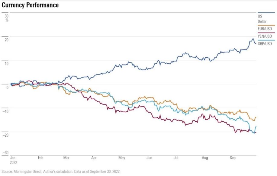 After a rally in July, global stocks and bonds turned lower and registered negative returns for the last quarter. We are witnessing a powerful moment in modern market history. Following the rare feat of seeing both stock and bond prices fall two quarters in a row, we’ve now seen it happen for three. After an early July report showing inflation may have peaked, investors started to believe that the interest rate tightening may soon end. And then, in August, markets absorbed the one-two punch of higher-than-expected inflation followed by this very clear message from Chairman Jerome Powell: