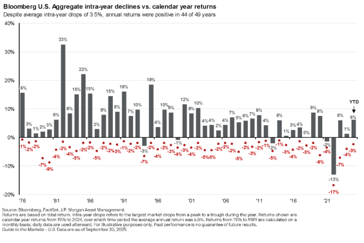 BOND HISTORY: Bonds complements stocks in a diversified allocation. They have lower expected returns and drawdowns than stocks. However, even bonds have intra-year declines.