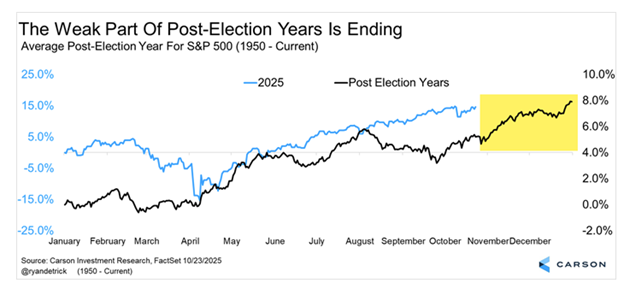 WHAT’S NEXT?: November and December in post-election years are historically “up.” We continue to see elevated inflation, and the Fed is cutting rates.