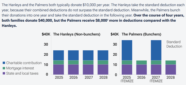 TAX STRATEGY—BUNCHING: Bunching is a tax strategy where you consolidate multiple years’ worth of charitable donations or other itemized deductions into a single tax year. It’s very effective when combined with a donor-advised fund and gifting appreciated securities. Here’s a helpful illustration: