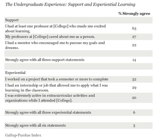 COLLEGE PREPAREDNESS FOR LIFE: In a Gallup poll, just 3% of college graduates say they had all six experiences that strongly relate to whether they felt like colleges prepared them well for life. Given the cost of college education, this type of reporting highlights the frequent disconnect in expectations between the student, parents, professors, and institutions: