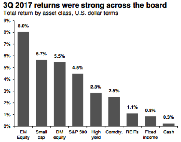 Improving economic data and earnings forecasts aided the increase in international stocks.  A weaker U.S. dollar has also contributed to the relative outperformance of international companies in 2017.  U.S. small cap stocks outperformed U.S. large cap stocks in the quarter, which was a change from Q2.  This is attributable to improving economic data and increased hopes of tax reform.