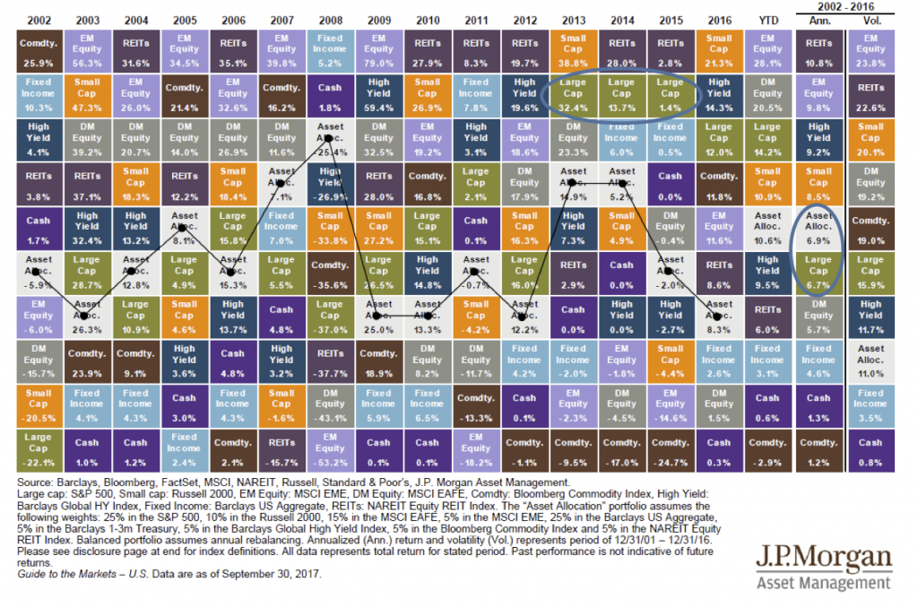 This is a question we have been asked frequently in recent years as the S&P 500, represented as Large Cap in the below table, experienced three years of strong relative outperformance versus other asset classes (highlighted below).   It is atypical for an area of the market to lead for three consecutive years and we wouldn’t be surprised if international and emerging markets stocks continued to lead for some time as a result.  Interestingly, during the 2002–2016 period, a diversified portfolio of just 55% stocks, represented by Asset Allocation in the below table, had a slightly better annualized return at 6.9% than Large Cap’s 6.7% result –  and with about 30% less volatility.