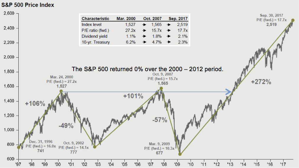 How did the S&P 500 end up so far down the annualized return list in the above table?  Well, between 2000 and 2012, the S&P 500 returned a mere 0%.  That’s right, twelve years of results that you would not have been happy with if all of your eggs were in the S&P 500 basket.  During that same time period, emerging markets stocks returned 200% and real estate was up 100%.  The financial media labeled this period the “Lost Decade” for U.S. stocks given the lack of returns for the S&P 500.