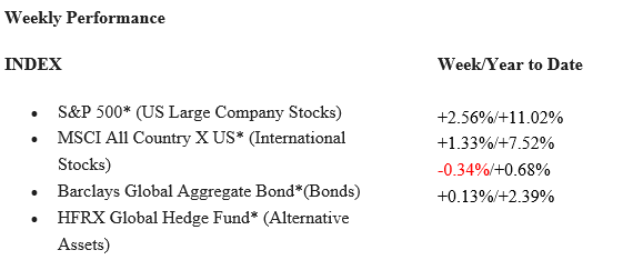 STOCKS RISE AGAIN:  Most tech companies have reported their fourth-quarter results, and most have exceeded expectations.  This has been one of the fundamental drivers of the stock rally.  On Friday, the tech-heavy NASDAQ Composite closed more than 20% higher than its Christmas Eve low.  In addition to the tech rally, a trade deal with China is looking more likely, and that positively influenced markets last week.  All major U.S. stock indices ended the week up over 2%.