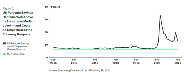 While a large portion of these gains are certainly a reflection of a return to normalcy after decreased demand depressed prices in 2020, the unprecedented level of stimulus and historically high levels of household savings is driving expectations for a surge in demand in the latter half of the year, which is driving increased inflation expectations and higher commodity prices.