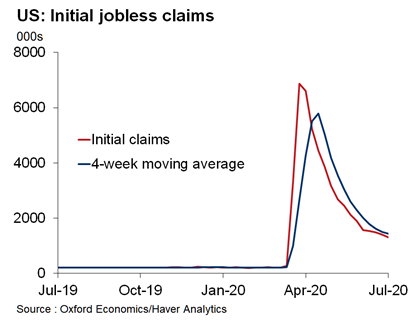 On the employment front, weekly new jobless claims are declining but are still in the 1.5 million range and could easily spike back up. Some states are acknowledging this by rolling back the reopening of restaurants, bars, and other businesses. Continuing claims are still running at about 18 million. While the graphs below show the recent improvements, they also illustrate how severe the unemployment situation still is compared to a few months ago before COVID-19 devastated the job markets.