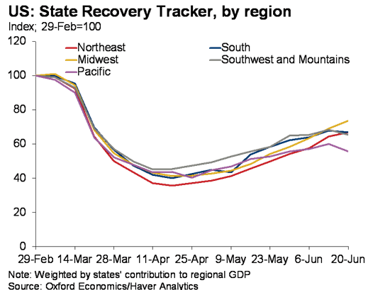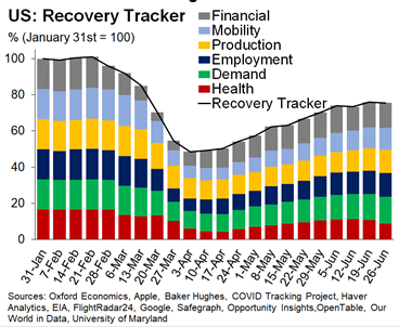 Positive consumer and small business confidence readings remain fragile but hopeful that virus containment measures (plus the development of therapeutics and vaccines) will significantly improve the health outlook sooner rather than later. The “Recovery Tracker” graph (next below) shows the rebound in different facets of economic activity but also highlights the slowdown in its acceleration along with the recent deterioration of the health component. The second graph below shows the decline in activity that has been induced by a resurgence of the virus in some of the southern and western hot-spots in the country that reopened more aggressively. As we stated earlier, the extent to which this could slow growth in the months ahead will require further vigilance.