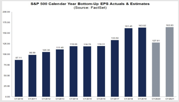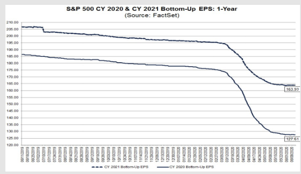 The S&P 500 dropped 34% from its February high to the low on March 23, and thereafter rebounded 42%. The Dow is lagging slightly while the NASDAQ is positive year to date. Stock markets will continue to be volatile, driven by expectations and perceptions about the impact of the corona-virus on the economy and on corporate earnings. While earnings projections for this year and next have stabilized lately, the first graph below shows how much profitability-forecasts declined over the past few months. The second graph below shows that 2021 earnings estimates are almost identical to what was attained last year.